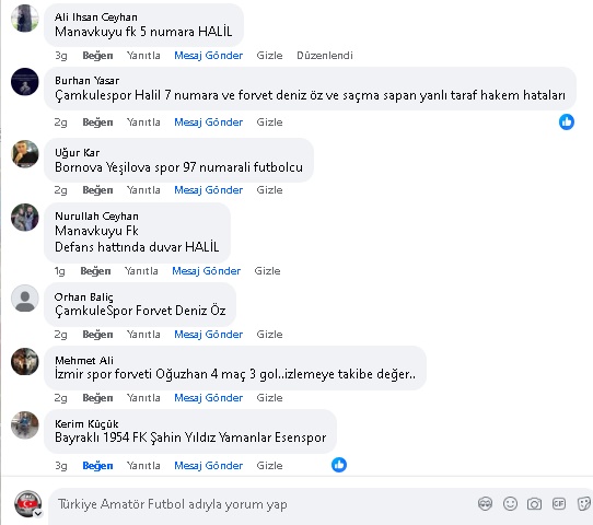 Sizlerden gelen yorumlar ve geçen 6 hafta içerisinde İzmir Süper Amatör Ligde dikkat çeken isimler şu şekilde oluştu ;